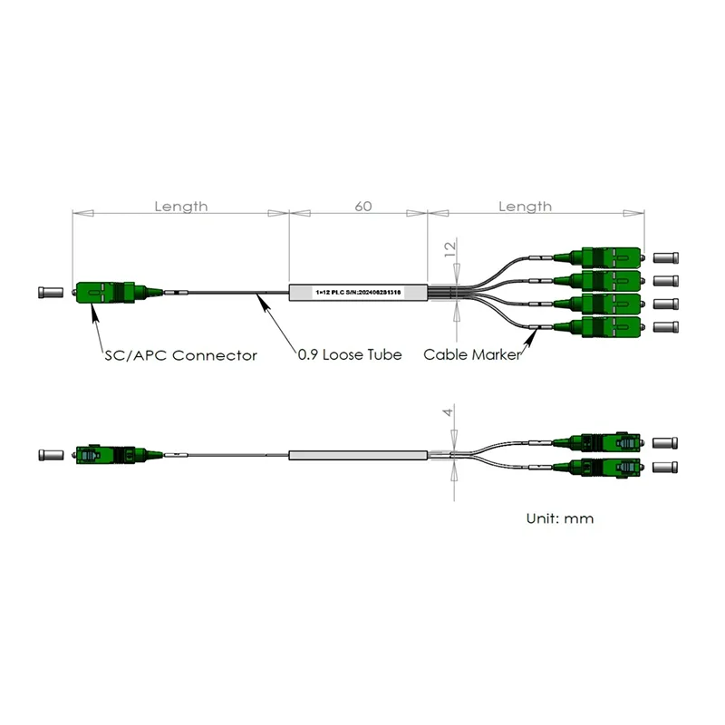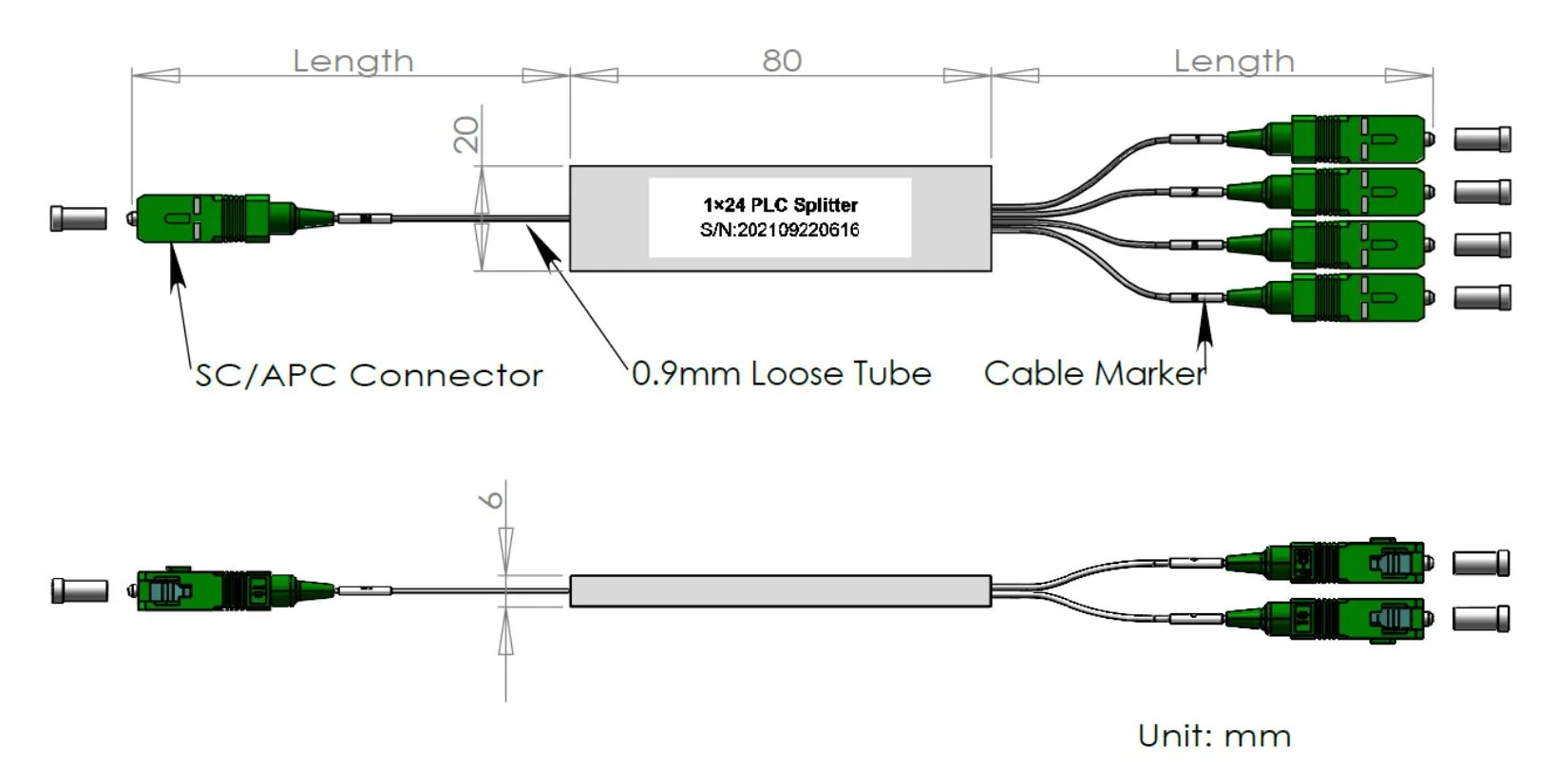 1x12/1 × 24 plc Splitter Steel Tube փաթեթ 60x12x4 եւ 80x20x4mm, 900 մ մկմ չամրացված խողովակ 1.0 + 0,1 / -0m, SC / APC միակցիչ: