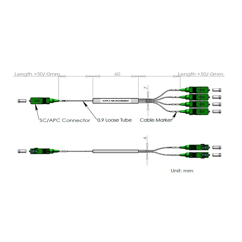 1 × 8 plc splitter պողպատե խողովակի փաթեթ 60x7x4mm, 900 մ մկմ չամրացված խողովակ 1.0 եւ 0.75 + 0.05 / -0m, SC / APC միակցիչ: